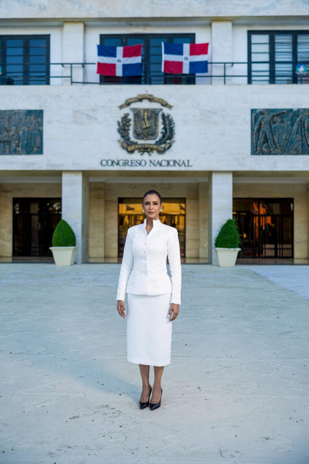 Fiel a un estilo elegante y sobrio, Méndez eligió un traje en tono blanco, respetando las reglas de protocolo de la ocasión solemne, diseñado por Suzelle Taveras, de la casa Modas Bride to Be. La pieza, confeccionada con cortes verticales, cuello alto y bordada a mano; proyectó distinción y atemporalidad, realzando el porte y seguridad de la legisladora.